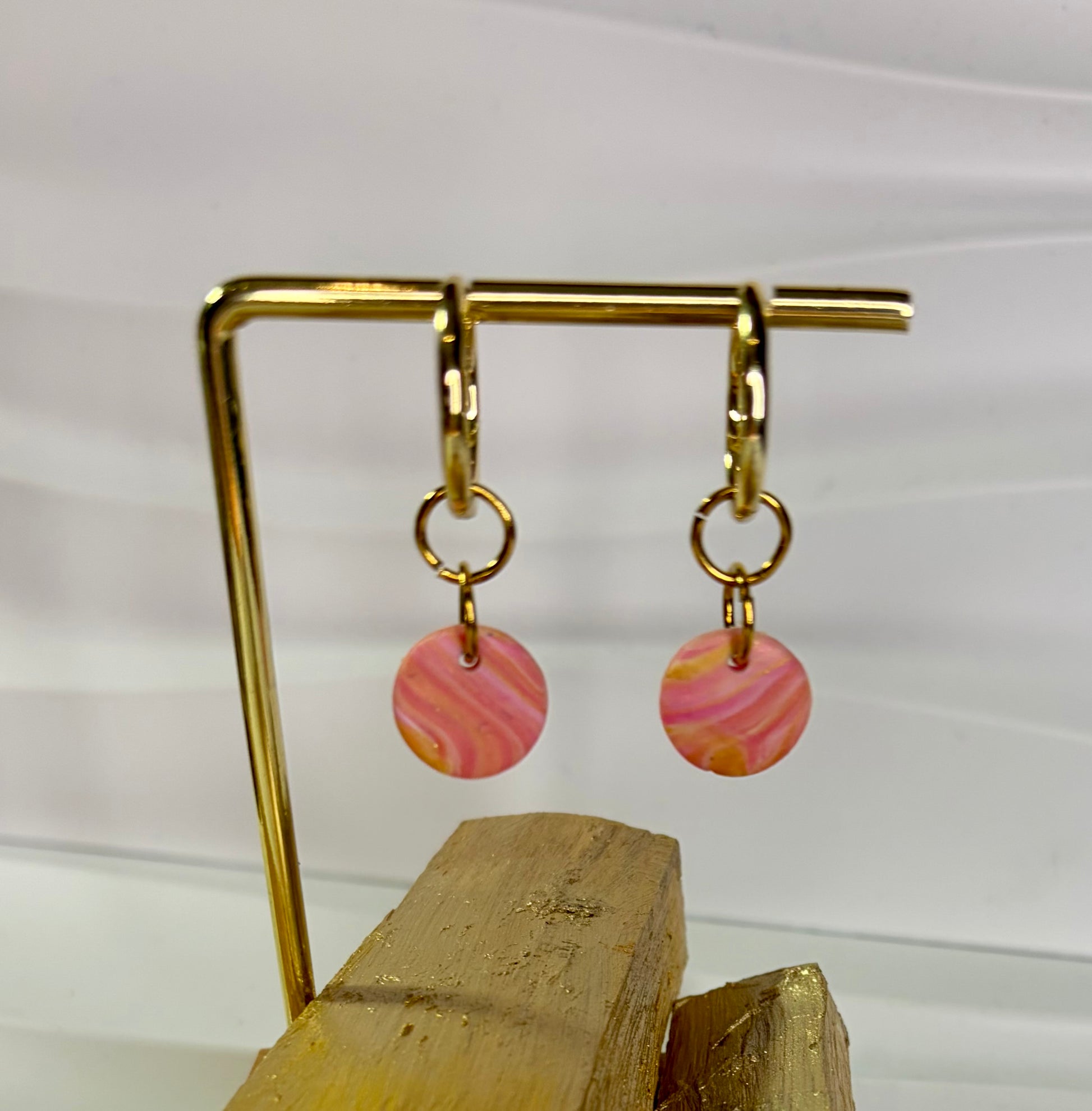Håndlagde øredobber i polymerleire. Små runde anheng. Leiren er veldig lett og tynger inne! Øreringene er gullbelagte. Du kan også skifte anheng fra Finnmarkskunst med de samme ringene.